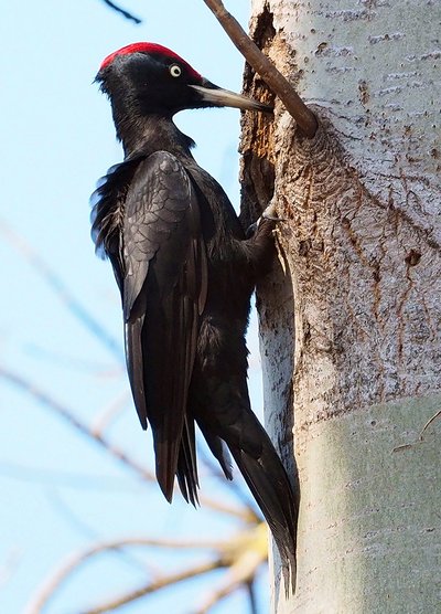 Atteignant la taille d’une corneille, le pic noir est le plus grand pic d’Europe. Alors que la mâle arbore une longue calotte rouge, la femelle ne porte qu’une petite tache rouge à la nuque. Toujours prêt à chanter, il dispose de toute une gamme d’émissions sonores, qui s’entendent souvent de loin.